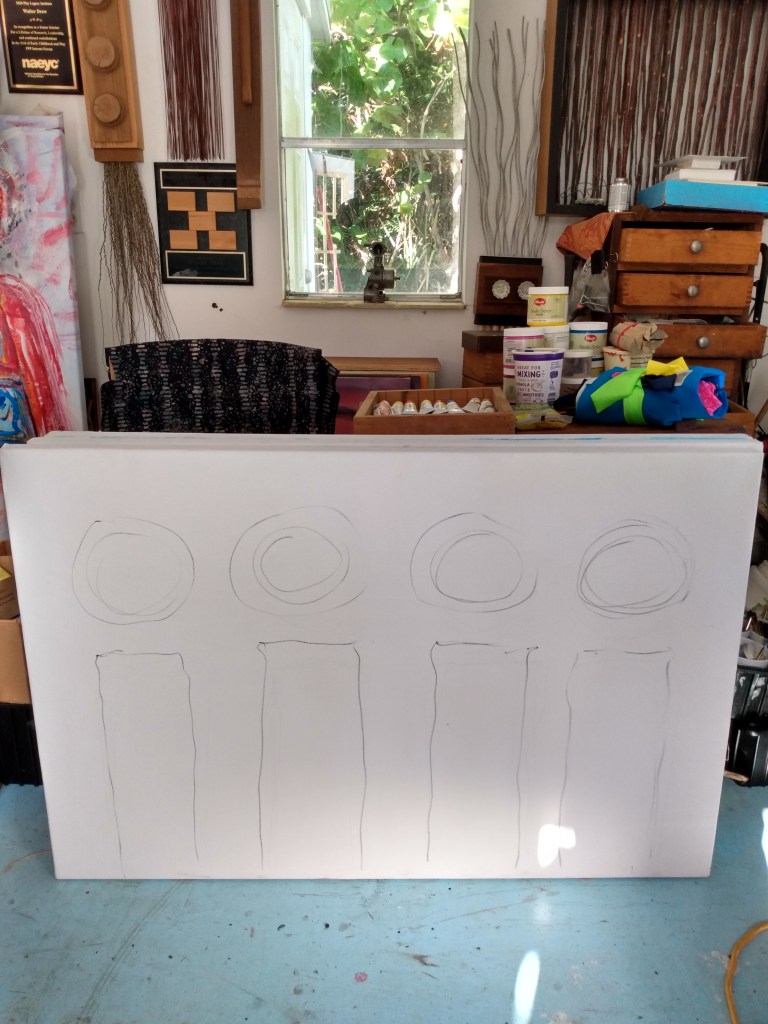 Winnie shares her thoughts, “I began with thoughts of an outside stage but it changed to more traditional with people in acting groups. The driftwood reflected the primitive nature of the environment – purple people, the actors.