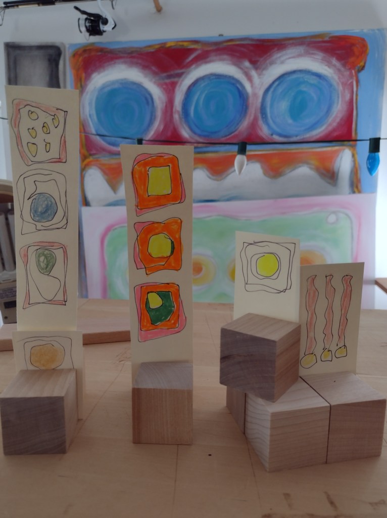 Janet played with large colorful shapes of foam and wrote, “I allowed the materials to dictate what I wanted to build. It became a vision and using random shapes made it seem as if it were a cartoon playing out in my mind. Very creative imagery, very calming.“