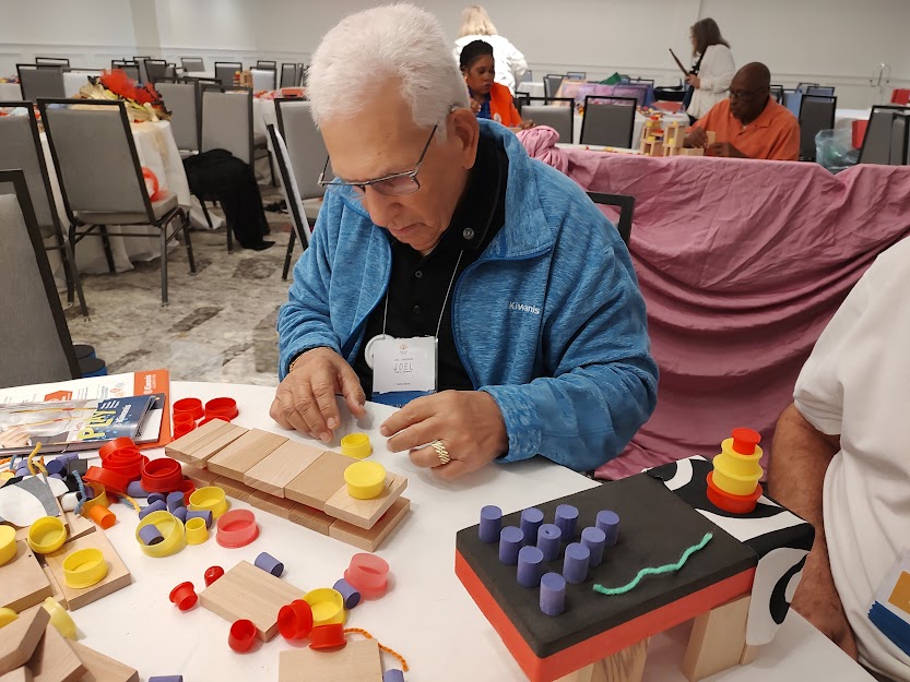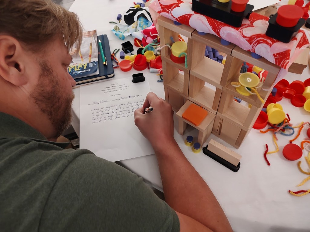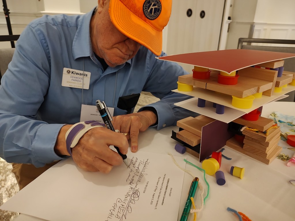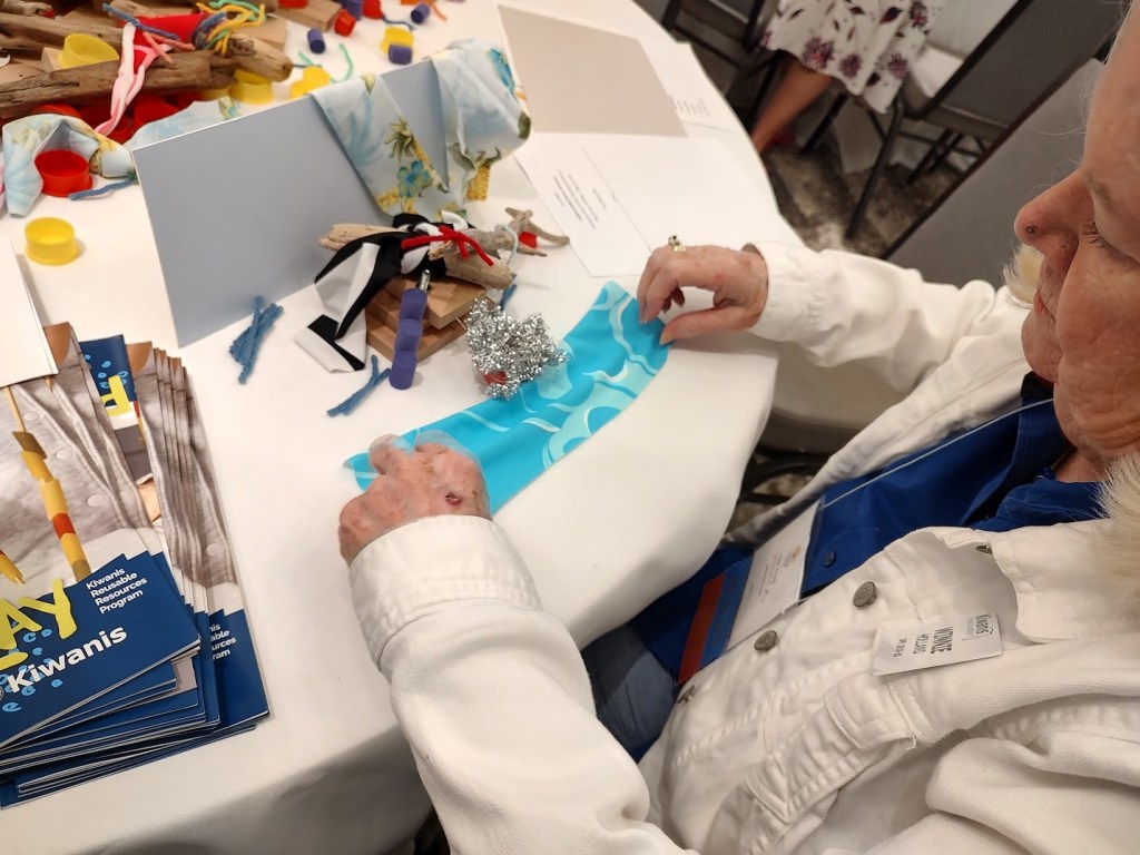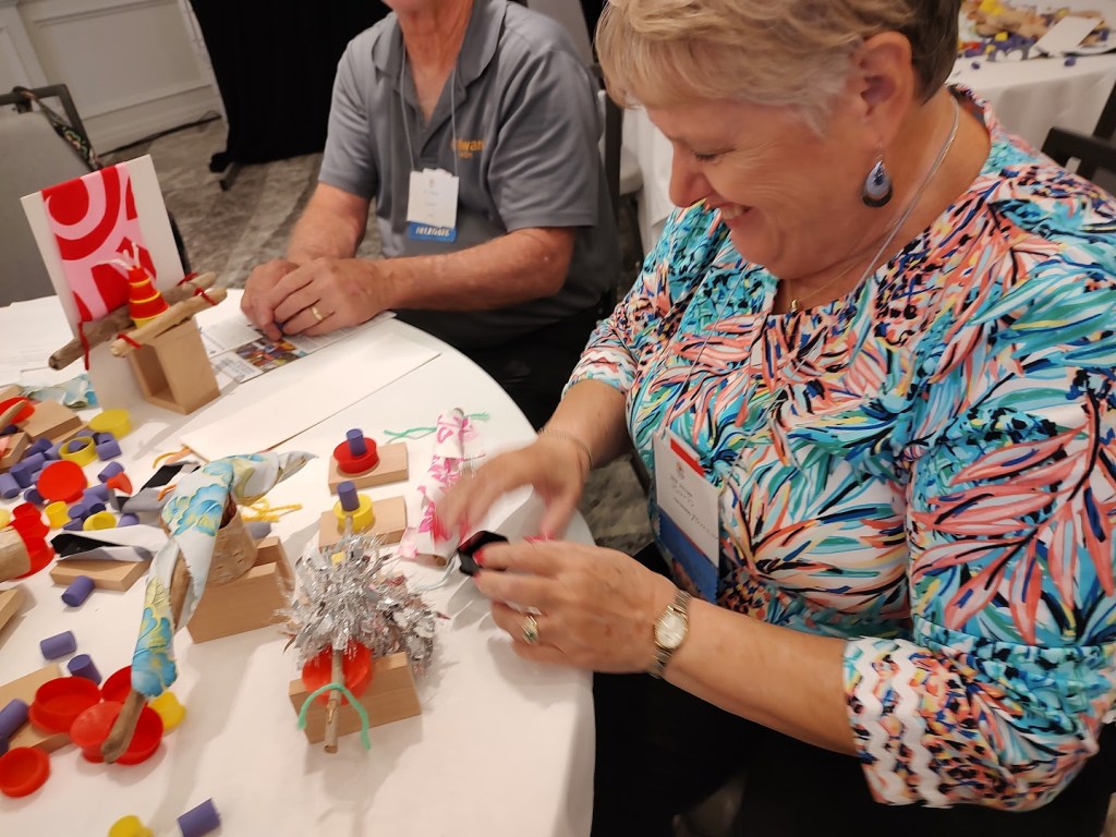 “Gardening is one of the things I do to relieve stress, so I made a flower.“,wrote Sophia after playing with large pieces of colorful fabric and black plastic shavings in a Kiwanis LET’s PLAY workshop. It happened at the Florida Kiwanis District Annual Convention on August 9, 2025. Following are photos and reflections that help to convey the value and power of play in the lives of young children and the adults who serve them.