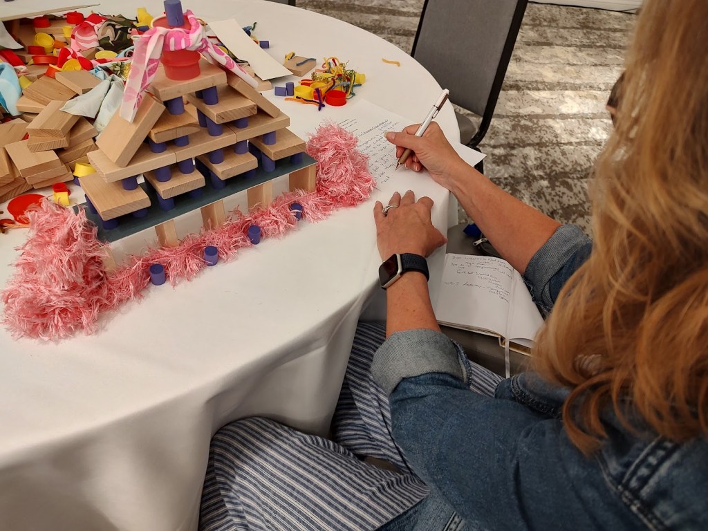 Melissa shares with us a journalized memory of her play, “We were chatting during the workshop today about libraries. I started creating an enormous bookshelf that morphed into the main structure of the library. I made tables, and chairs, a rug with flex seating and imagined kids and adults alike coming to the library to experience a larger-than-life book. Hopefully, they are transported to a happy place.